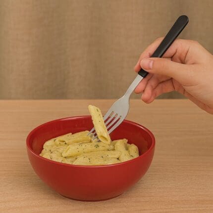 Com o garfo de mesa Tramontina Leme com lâmina em aço inox e cabo de polipropileno.