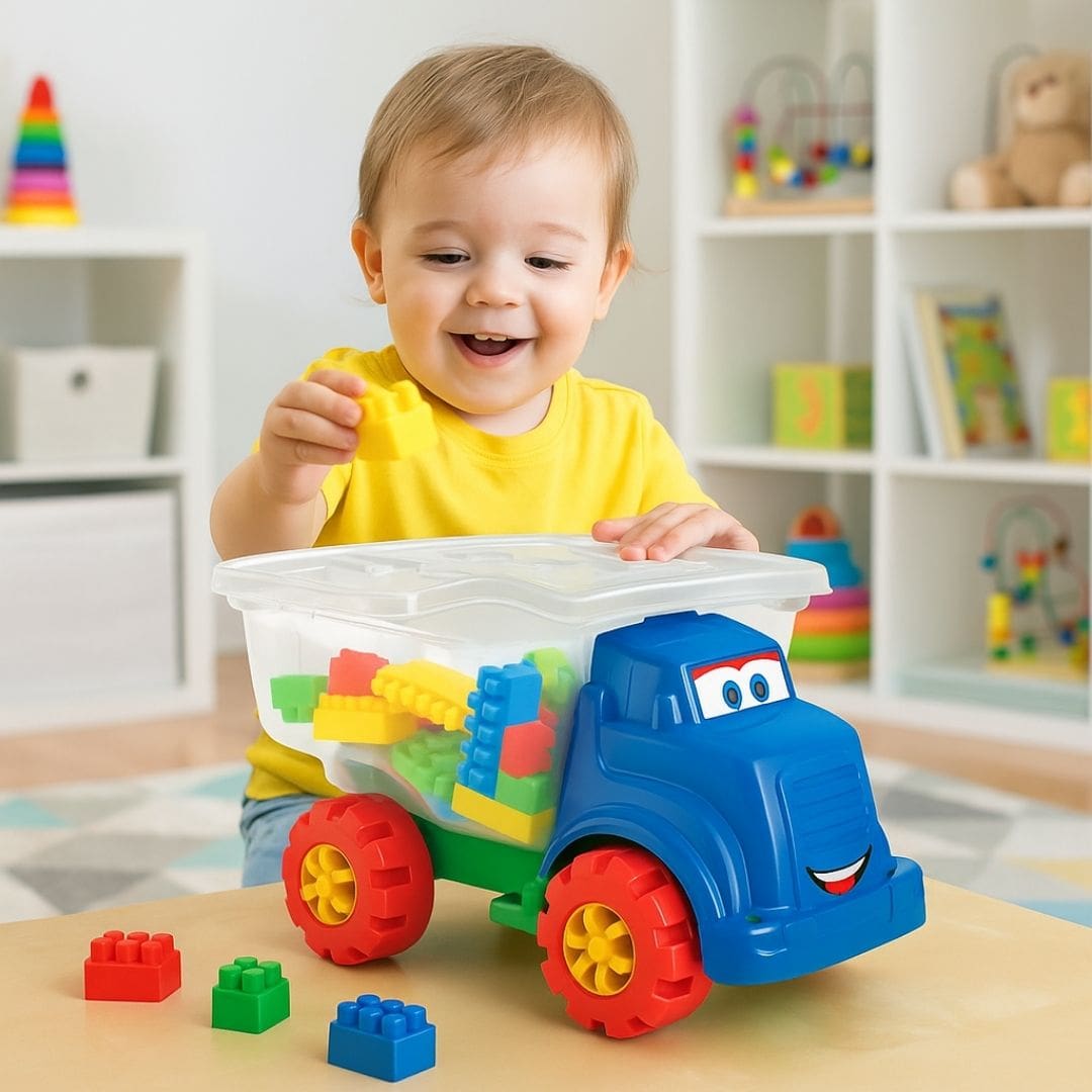 O destaque deste kit é o charmoso caminhão Babytruck, que não é apenas um brinquedo, mas um transportador de diversão! Ele serve como base para carregar os bloquinhos coloridos e também como um elemento para a criança empurrar e brincar, estimulando a coordenação motora ampla e o engatinhar/andar. A caçamba do caminhão é perfeita para guardar e transportar os blocos, incentivando a organização após a brincadeira.