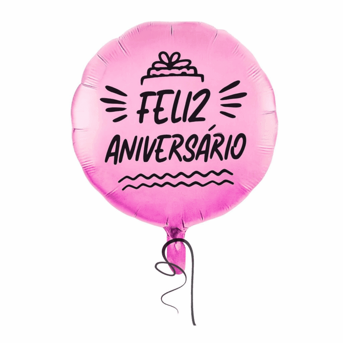 Design: Formato de bola com estampa “Feliz Aniversário” e elementos festivos.