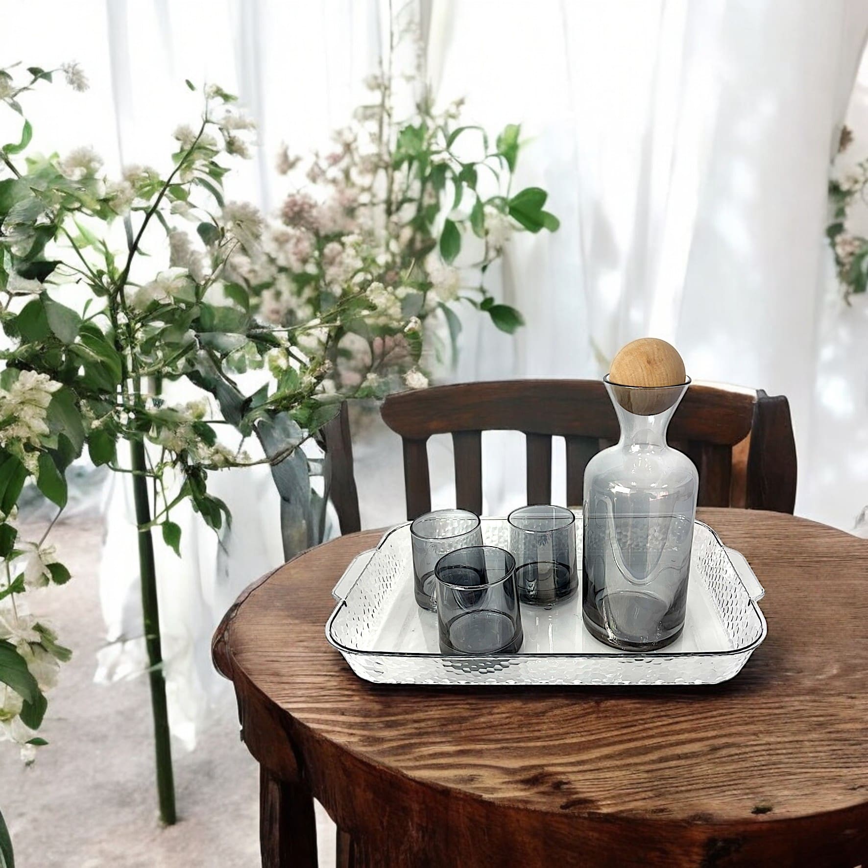 • Transparência: O acrílico transparente permite visualizar os objetos dispostos na bandeja, criando um efeito visual leve e elegante.