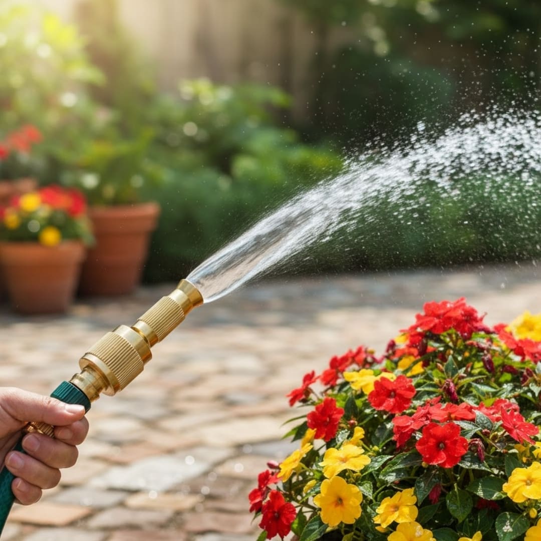 - Jato Regulável (Alta Pressão): O bico permite o ajuste do tipo de jato apenas girando sua ponta, variando de um fino e potente jato concentrado (ideal para remover sujeira incrustada) a um spray suave (perfeito para regar plantas delicadas).