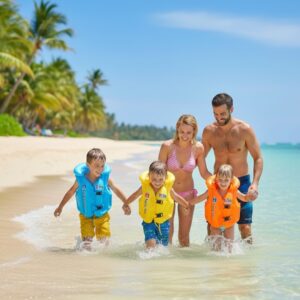 Formato Colete: O design tipo colete abraça o tronco da criança, garantindo que ela permaneça em uma posição vertical e estável na água, o que é mais seguro do que as bóias de braço ou cintura.