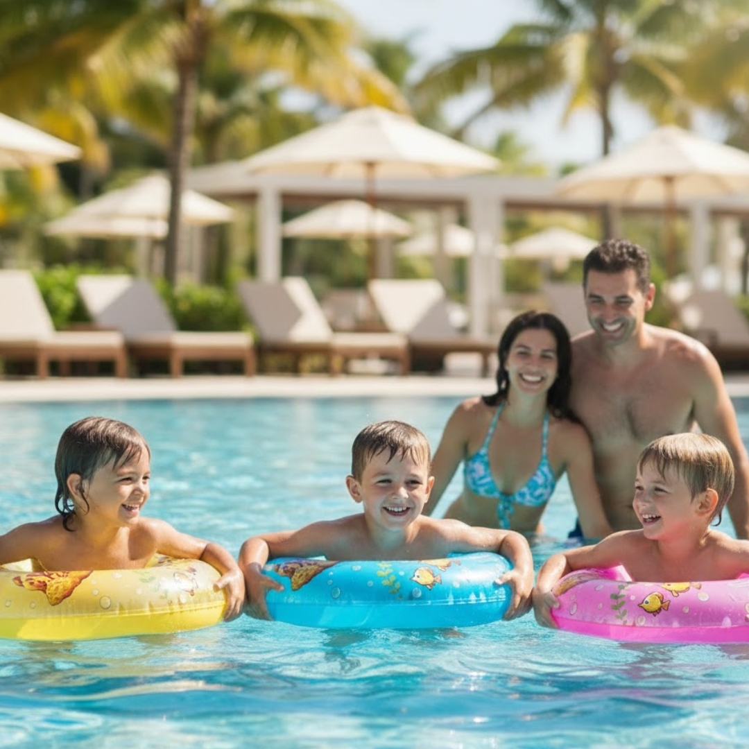 Formato Tradicional: Seu design circular clássico oferece flutuação estável e equilibrada, permitindo que o usuário relaxe enquanto permanece parcialmente submerso e refrescado.