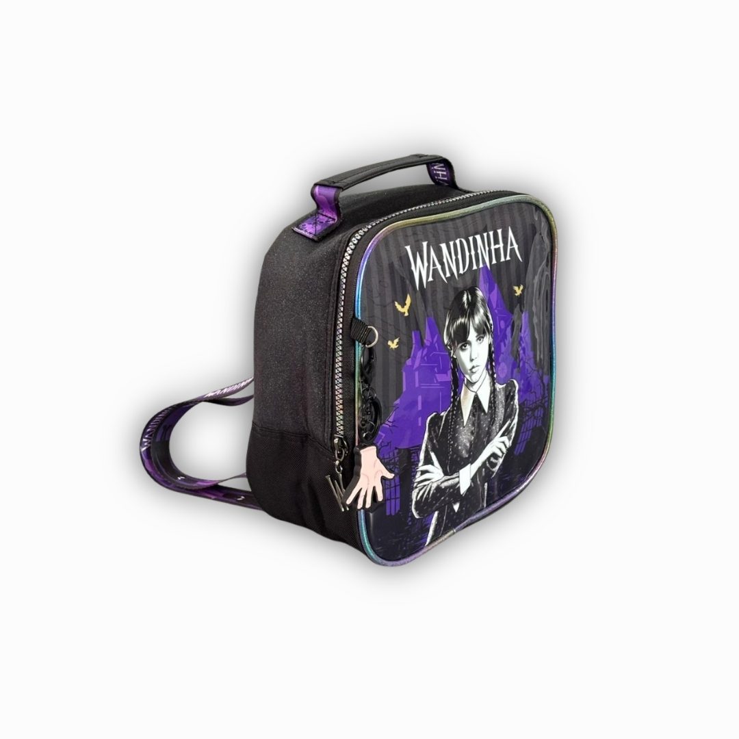 Design Oficial e Espaçoso: O design externo apresenta estampas e cores inspiradas no universo de Wandinha (Wednesday), com foco no preto e detalhes góticos. Com tamanho compacto e eficiente, a bolsa possui espaço suficiente para potes, garrafinhas e frutas, além de ser fácil de limpar internamente em caso de vazamentos.