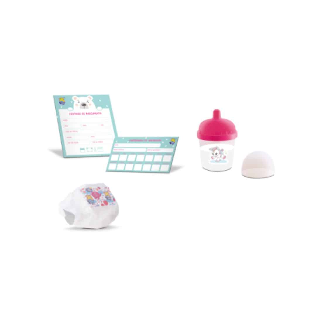 • Acessórios incluídos: Mamadeira, chupeta, fralda de pano, roupinha completa, e manta.