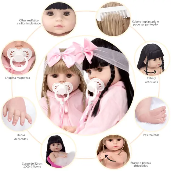 - Realismo impressionante: Detalhes pintados à mão, microenraizamento de cabelo e textura de pele que simulam um bebê de verdade.