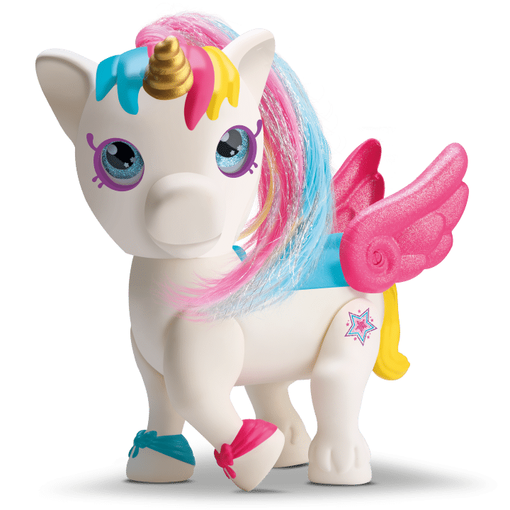 Seu chifre dourado reluz com um brilho fascinante, adicionando um toque de realeza e mistério ao seu design. As cores do arco-íris adornam seu corpo majestoso, criando um efeito deslumbrante e cativante que instantaneamente atrai os olhos e a imaginação de qualquer criança.