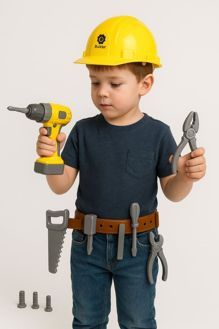 O conjunto inclui um capacete de segurança e um cinto de ferramentas ajustável, fazendo com que a criança se sinta um profissional de verdade. Além disso, vem com uma variedade de ferramentas de brinquedo essenciais, como martelo, chave de fenda, serrote, chave de boca, esquadro e muitos outros acessórios.