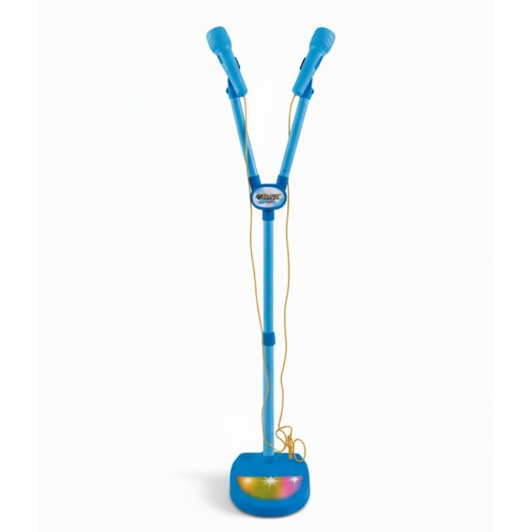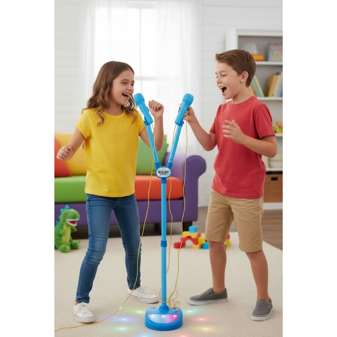 Microfone duplo com pedestal ajustável e jogo de luzes vibrantes, perfeito para duetos e apresentações de mini-estrelas.