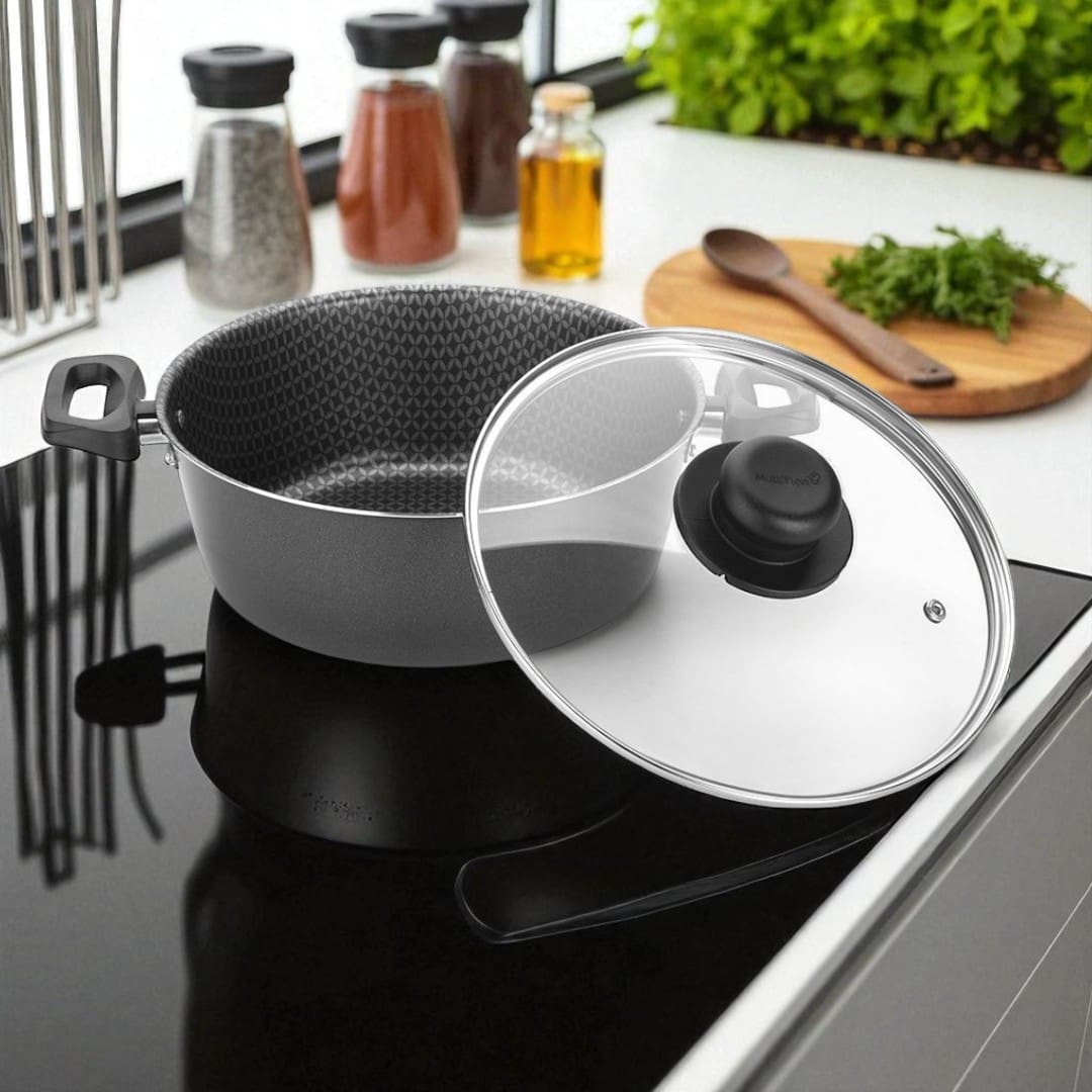 Eleve sua experiência culinária com a Caçarola de Alumínio com Revestimento Antiaderente e Tampa de Vidro Nº24 da Linha Essencial – Multiflon. Essencial para qualquer cozinha, esta caçarola combina design moderno, alta performance e praticidade para o preparo das suas receitas favoritas, desde ensopados e molhos até gratinados e cozidos.