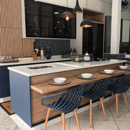 Azul Marinho: Uma cor profunda e elegante que transmite calma e serenidade. O revestimento em azul marinho confere um toque de cor sofisticado ao ambiente, harmonizando com decorações tanto claras quanto escuras.