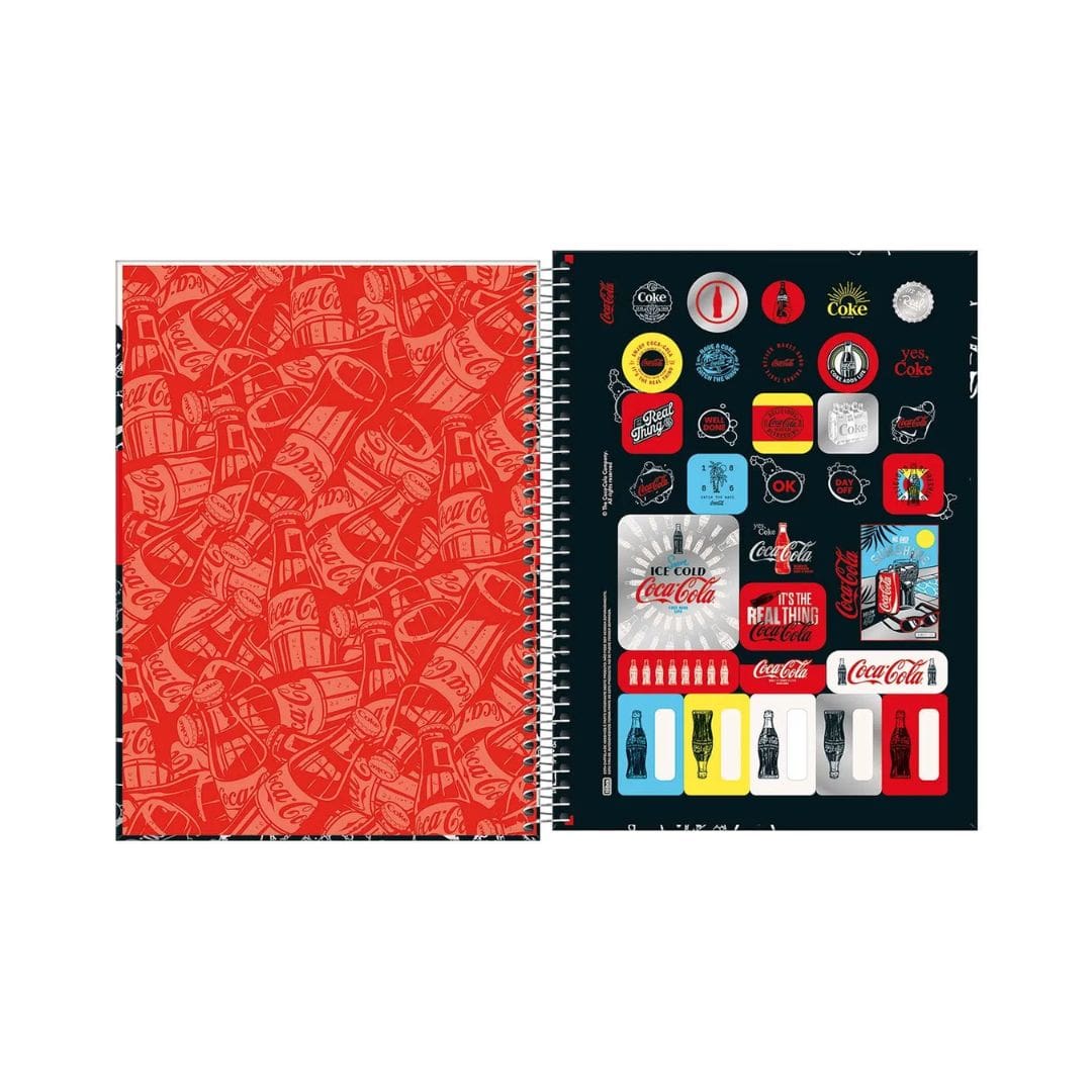 - Design exclusivo: A capa do caderno apresenta o icônico logo da Coca-Cola em diversas versões, com cores vibrantes e um design moderno que remete à marca.
