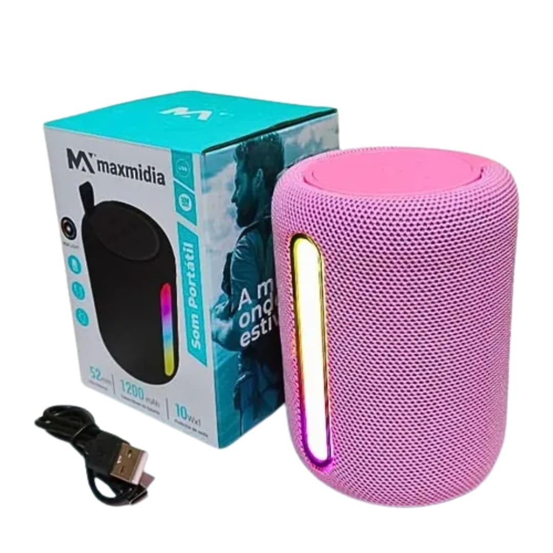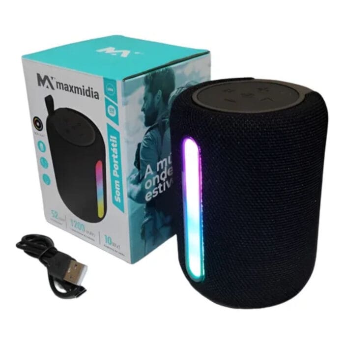 Com design moderno e compacto, a caixa de som portátil da Maxmidia é fácil de transportar e conectar via Bluetooth, permitindo que você desfrute de suas músicas sem fios e com praticidade.