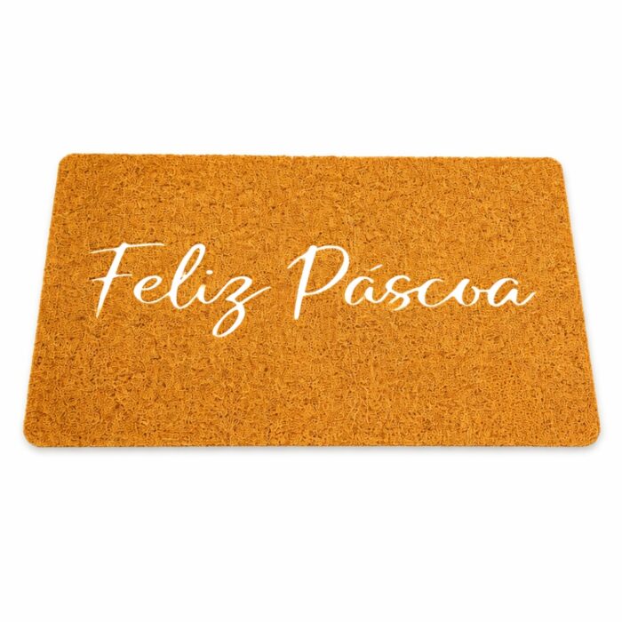 Mensagem Receptiva: A estampa “Feliz Páscoa” cria uma conexão imediata de gentileza com seus convidados e vizinhos.