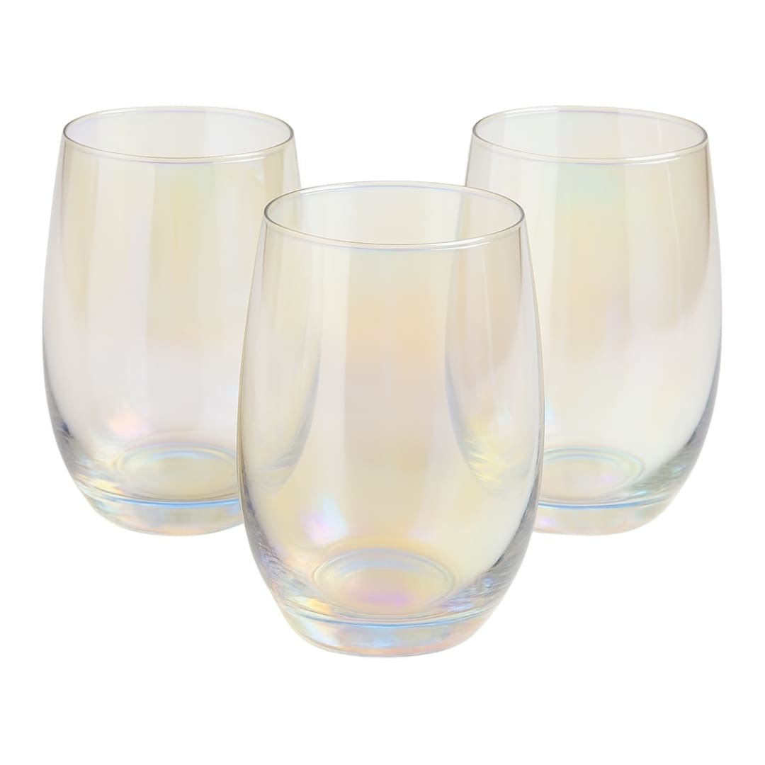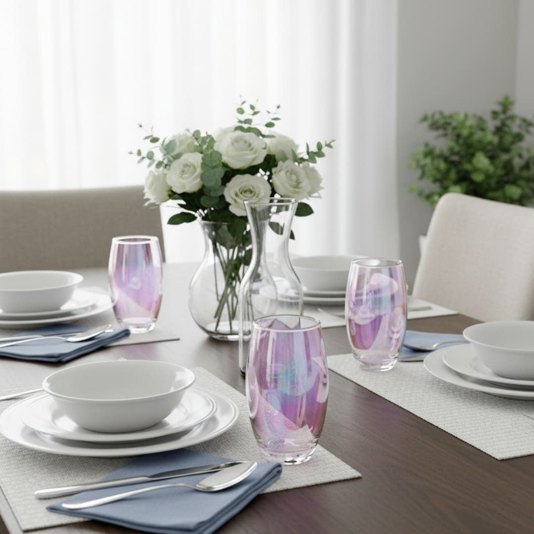 Esse copo é furta-cor (ou iridescente), porque reflete tons diferentes dependendo da luz e do ângulo de visão. Isso dá esse efeito meio arco-íris discreto que valoriza muito em fotos e também na mesa posta.