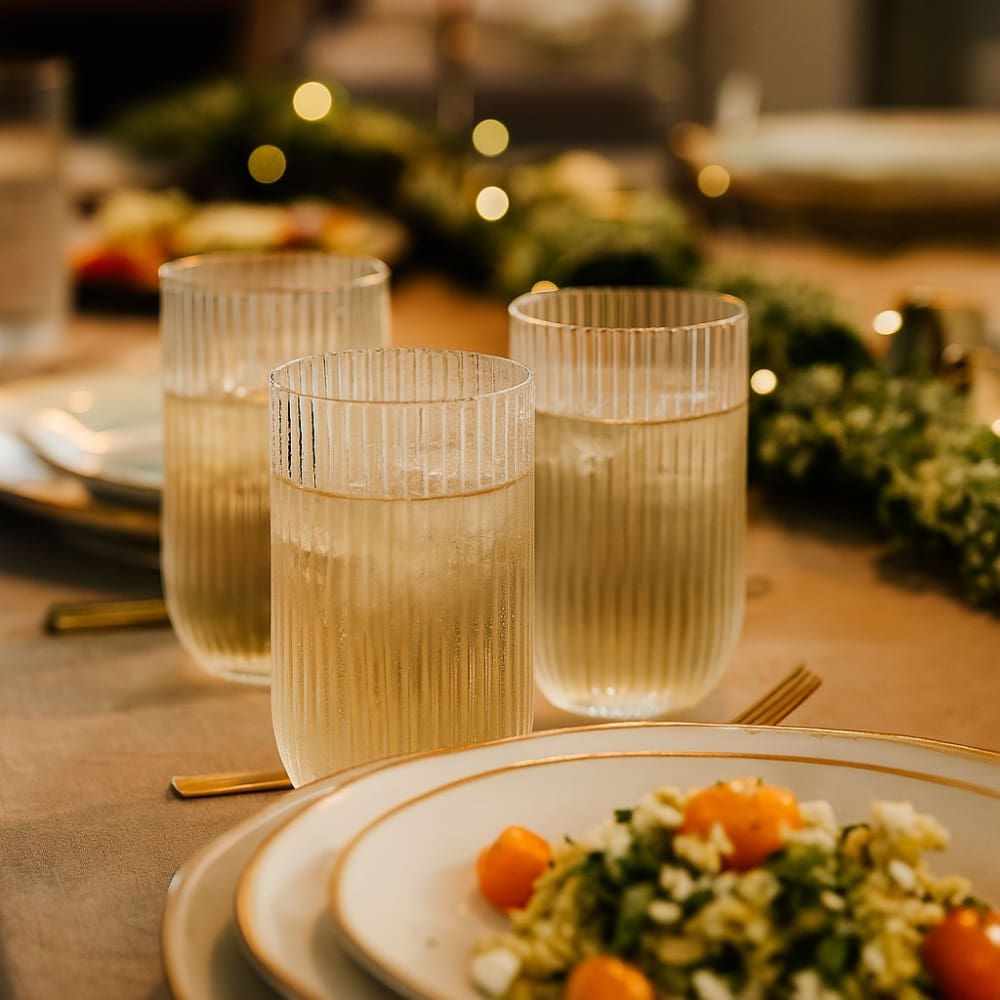 Cada copo, com generosos 450ml de capacidade, é ideal para servir uma variedade de bebidas, desde água e sucos refrescantes até coquetéis elaborados. Fabricados em vidro de alta qualidade, os copos da linha RAYÉ apresentam um design canelado exclusivo. Essa textura não só proporciona uma pegada mais segura e confortável, como também cria um fascinante jogo de luz e sombra, realçando a beleza de cada bebida.