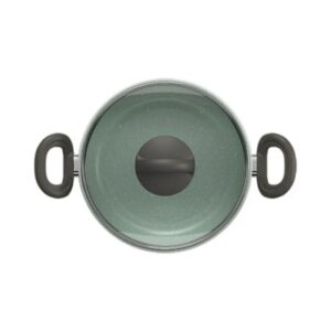 Na cor Verde com grânulos Branco, este jogo de panelas traz sensação de bem-estar à decoração. Os cabos, alças e poméis são produzidos em baquelite com 50% de resíduos recuperados, não aquecem. As tampas em vidro temperado têm saída de vapor, o que facilita para acompanhar a cocção.