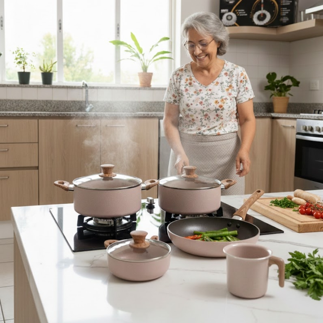 Fabricadas em alumínio (ou material similar de alta espessura) com revestimento antiaderente interno, as panelas evitam que os alimentos grudem, facilitando o cozimento e a limpeza. O antiaderente é resistente e contribui para um uso mais saudável, com menor necessidade de óleo.