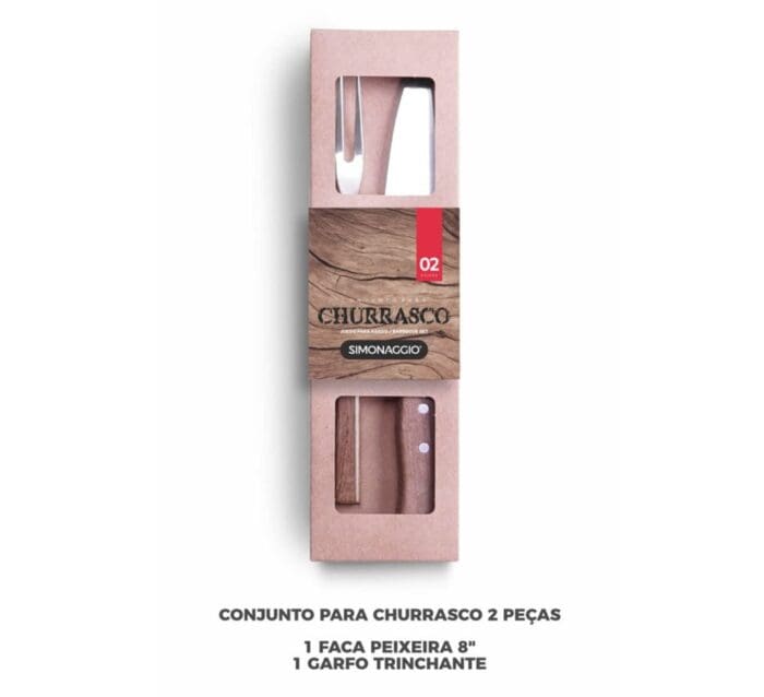 • Informações: A embalagem destaca que o conjunto inclui uma faca e um garfo, ambos para churrasco.
