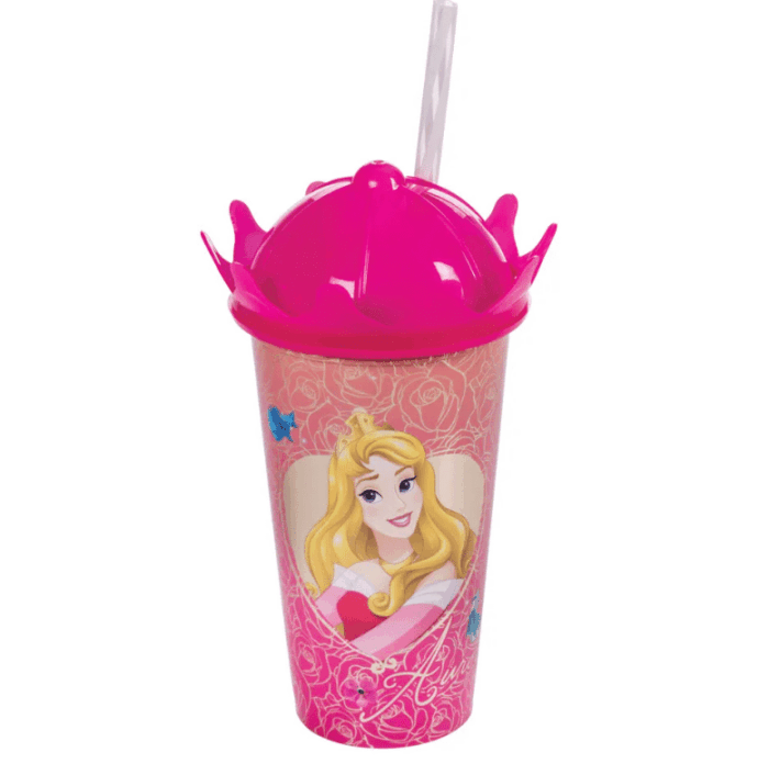 • Design: O copo apresenta um design decorado com a imagem da Bela Adormecida, complementado com uma tampa em formato de coroa, destacando o tema de princesa.