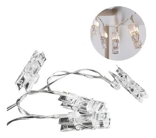 O cordão possui $\text{10}$ lâmpadas LED que servem também como mini prendedores transparentes. Basta prender suas fotos, cartões-postais, desenhos ou recados e vê-los iluminados com um brilho suave e charmoso.