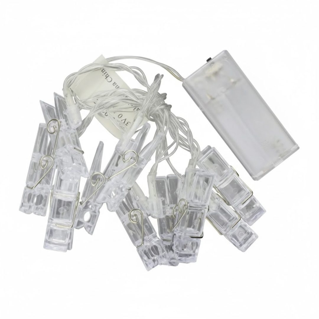 Transforme seu espaço em uma galeria de luz e memórias com a delicadeza e o estilo do Cordão de LED Mini Prendedores da Magizi.