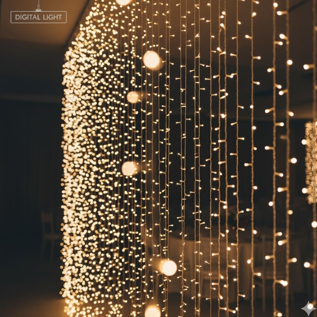 Esta Cortina de LED de 3×3 metros e 320 luzes Branco Quente cria um backdrop luminoso espetacular, perfeito para casamentos, festas e fachadas, com a qualidade profissional da Digital Light.