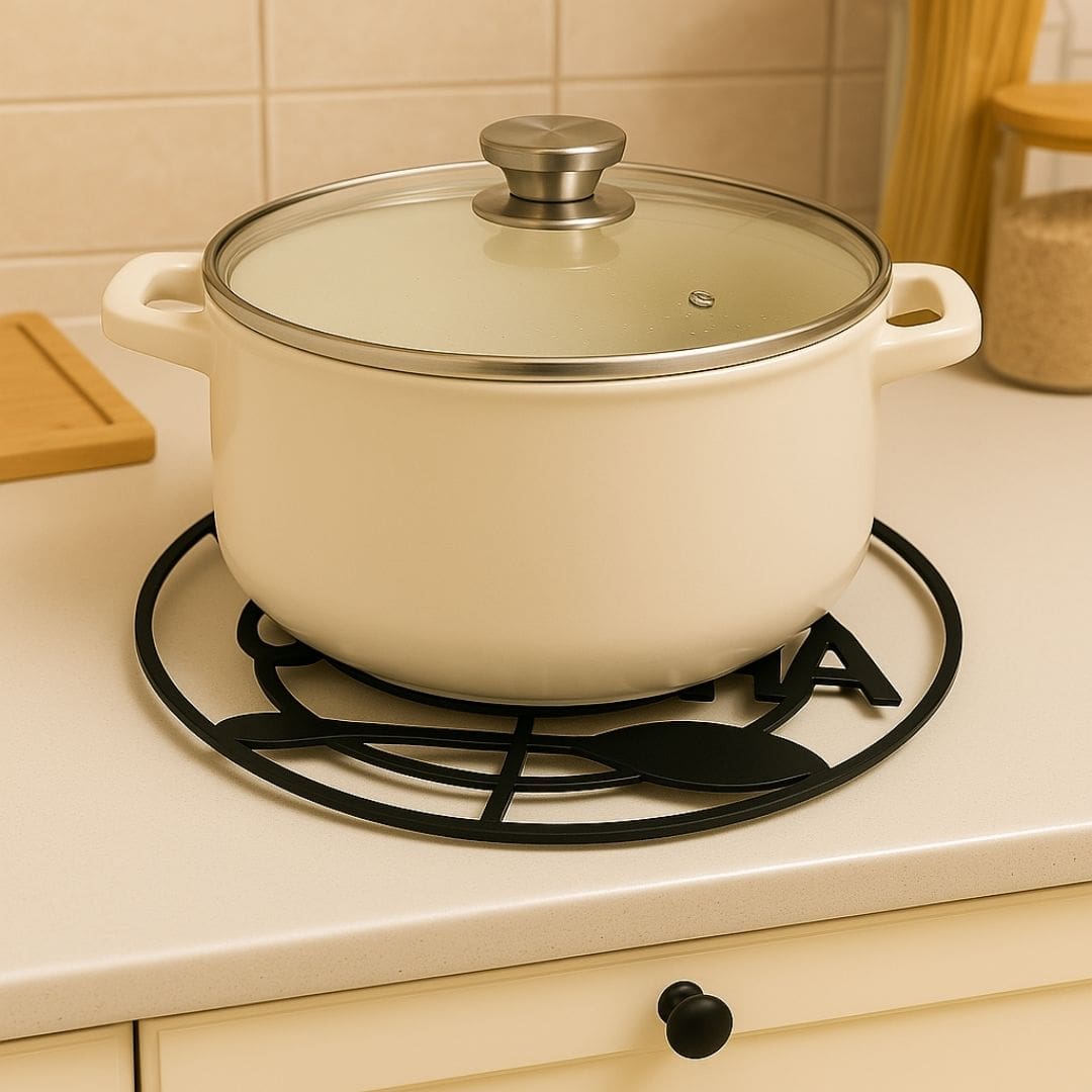 Fabricado em metal de alta qualidade, ele oferece resistência excepcional ao calor e à corrosão, garantindo uma longa vida útil. Seu tamanho compacto de 18x18cm é versátil, adequado para a maioria dos tamanhos de panelas e utensílios de cozinha, enquanto os detalhes cuidadosamente elaborados adicionam um toque de sofisticação à sua decoração. Além de sua função protetora, o design vazado permite uma melhor dissipação do calor, otimizando a segurança.