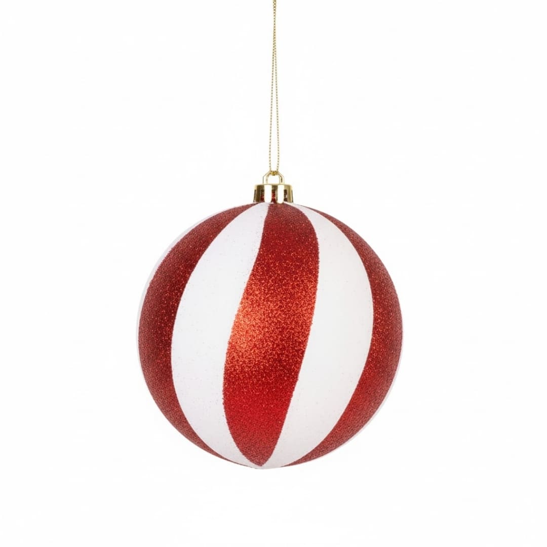 Esta bola decorativa da Wincy é um elemento-chave para uma decoração natalina clássica com tema de doces ou tradicional em Vermelho e Branco. O design é claramente inspirado nas icônicas Candy Canes, trazendo um toque lúdico e festivo.