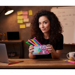 O Estojo Escolar Roxo Angel/Stitch é um item licenciado Disney, combinando a popularidade dos personagens de Lilo & Stitch com um acessório escolar prático e estiloso.
