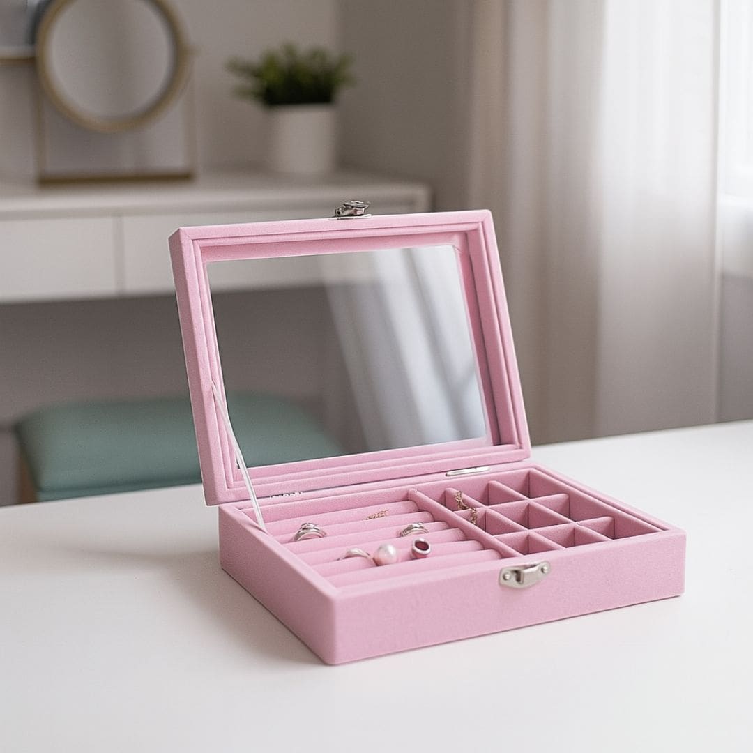 Estojo Organizador de Joias Aveludado com Tampa Transparente – Seu Tesouro Sempre à Mão e Protegido!