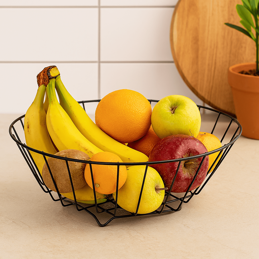 - Ventilação Ideal: Estrutura aramada que promove a circulação do ar, mantendo as frutas frescas por mais tempo.
