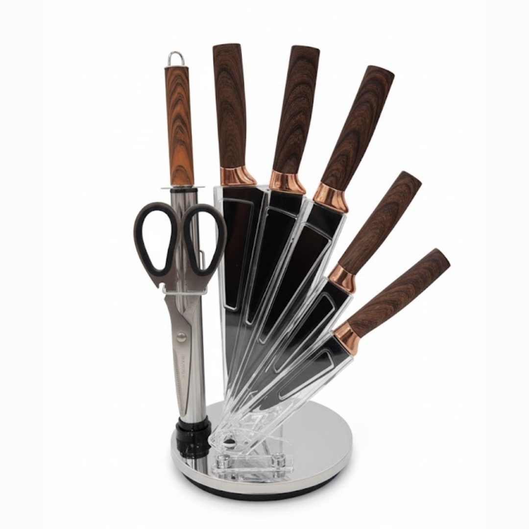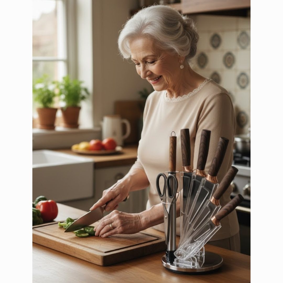Este elegante Jogo de Facas Casita com suporte giratório é o diferencial que faltava em sua bancada. Tenha acesso instantâneo e seguro a cada lâmina essencial, economizando espaço e adicionando um toque de modernidade ao ambiente. A solução 8 peças para quem busca eficiência e estilo na rotina culinária.