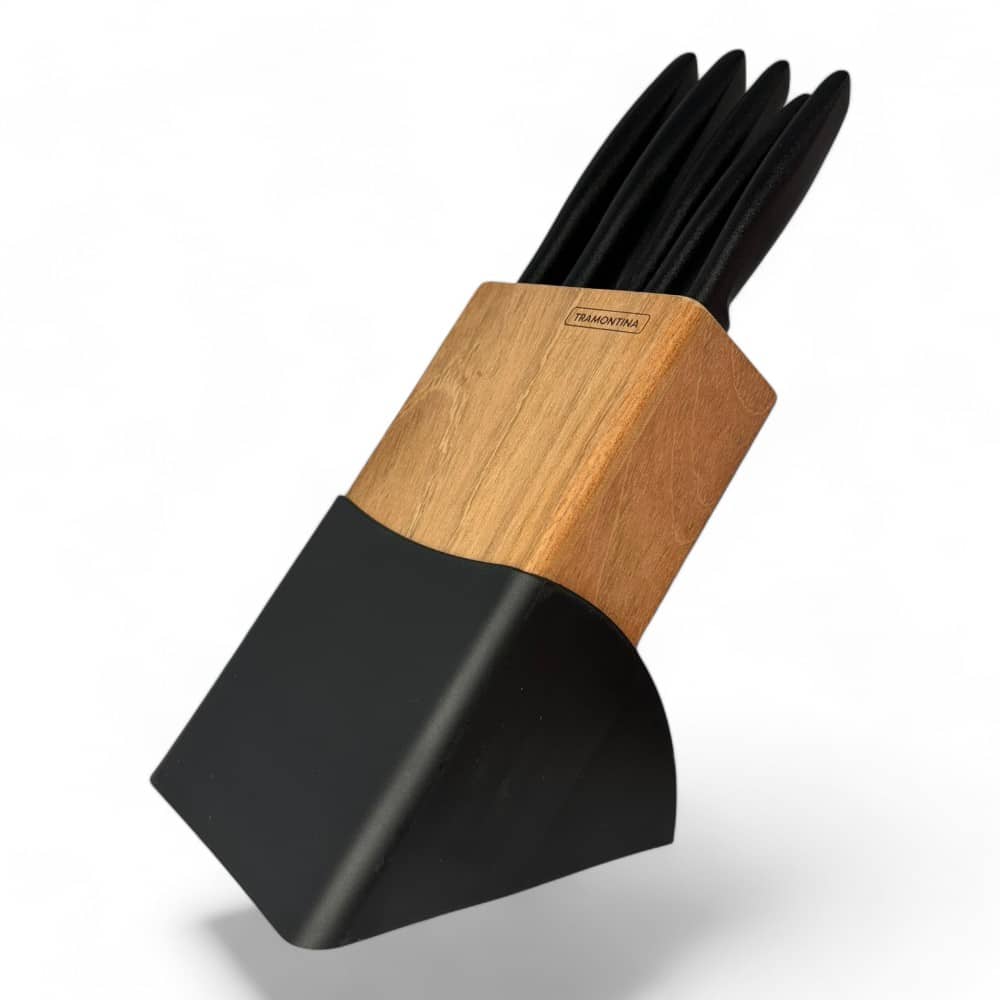 Jogo de Facas Tramontina Plenus com Lâminas em Aço Inox Cabos de Polipropileno Preto e Suporte de Madeira 6 Peças