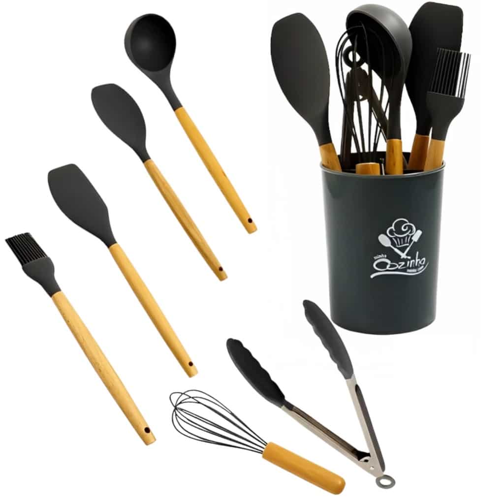 Versatilidade: Inclui uma colher de servir, espátula, concha, pincel, batedor de claras, pegador com travas e um porta-talheres com divisórias e fundo respirável.