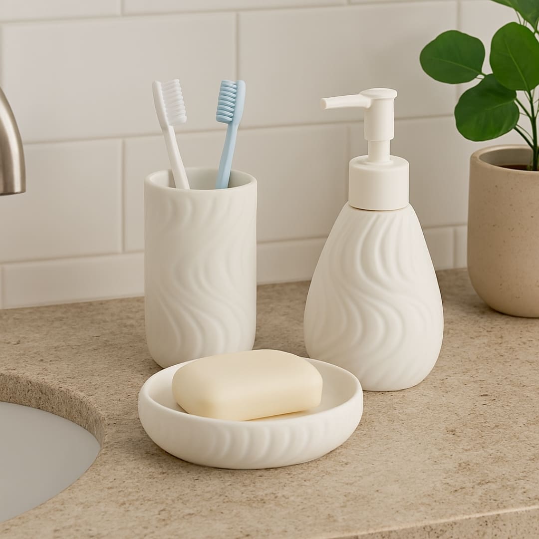 Transforme o visual do seu banheiro com o Kit Malta da Casa Aurora, composto por três peças em porcelana de alta qualidade. Com acabamento elegante e textura ondulada, esse conjunto une beleza e praticidade para o dia a dia.