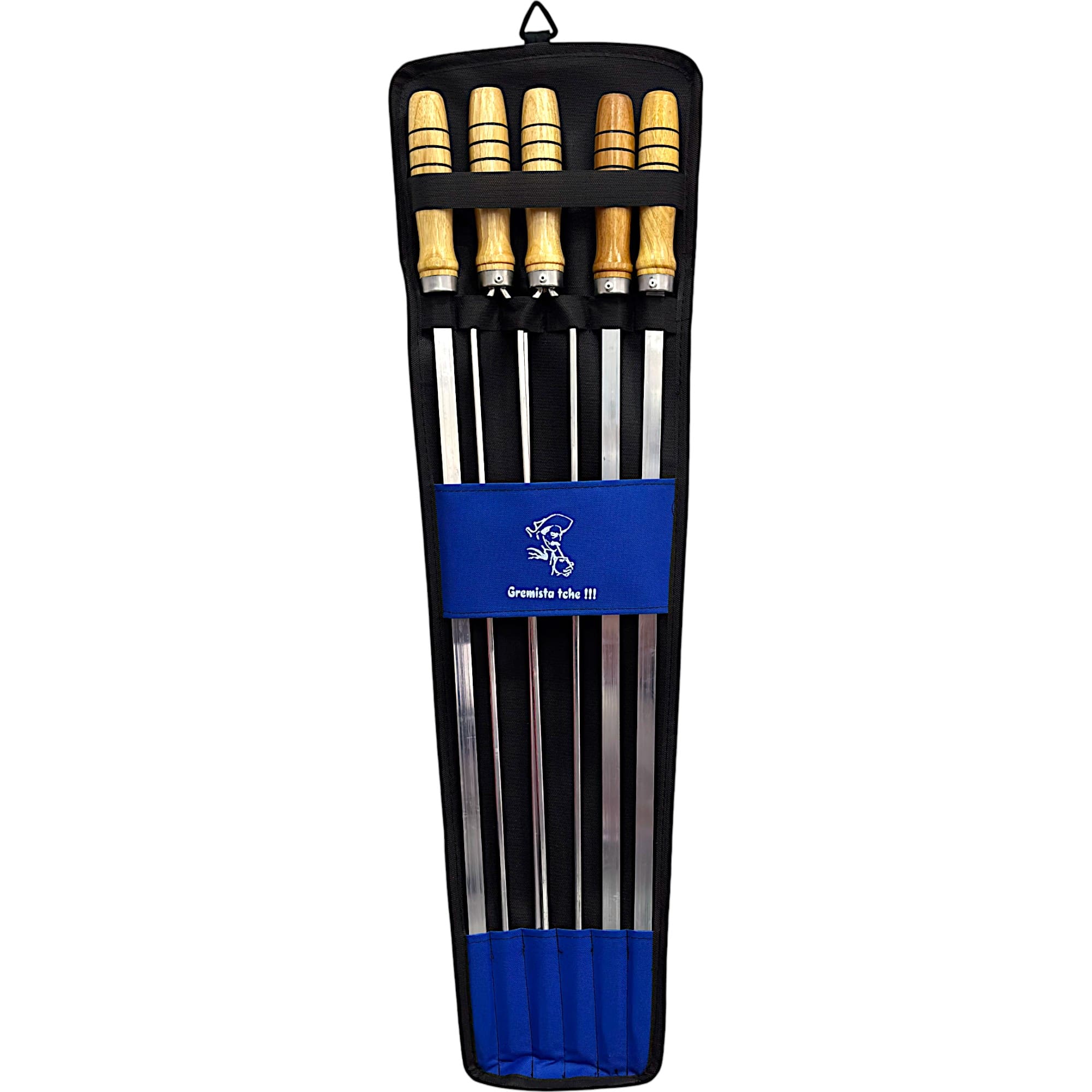 Este kit exclusivo, com 5 espetos cuidadosamente projetados, é o presente ideal para os amantes do bom churrasco e do futebol gaúcho.