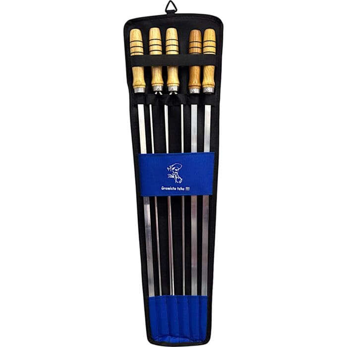 - 5 Espetos de aço inoxidável (2 duplos e 3 simples achatados), com cabos de madeira nobre.