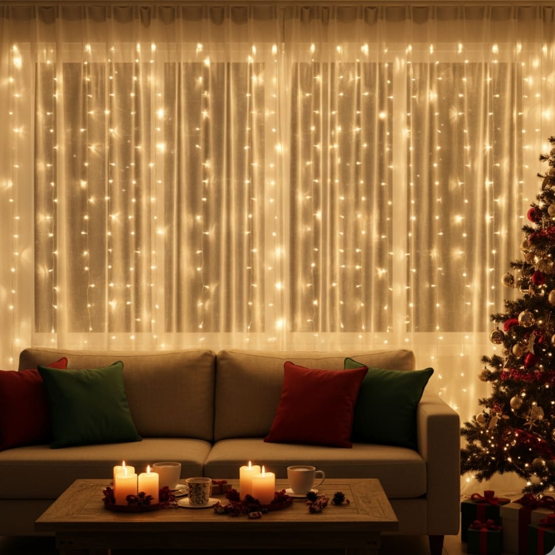 Cascata de 2,3 metros com 100 LEDs de luz quente, ideal para um visual elegante, acolhedor e festivo.