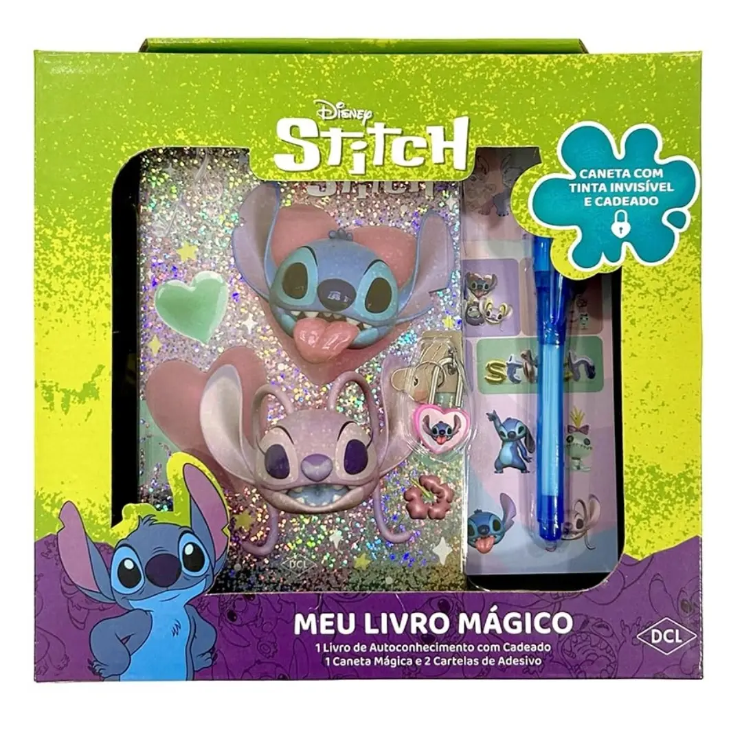 O grande destaque é a Caneta Mágica inclusa: escreva mensagens secretas que só podem ser reveladas ao iluminar o papel com a luz UV da ponta da caneta! Além disso, o kit acompanha uma cartela de adesivos temáticos do Stitch, perfeitos para decorar as páginas, customizar objetos ou selar os segredos. Com este livro, as crianças podem registrar suas aventuras, sonhos e desabafos, tudo sob a vigilância do seu personagem favorito da Disney. É o presente ideal para incentivar o hábito da escrita e a imaginação.