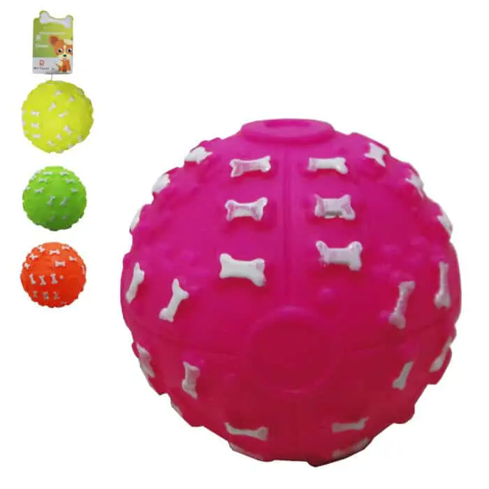 • Formato e Estrutura: O mordedor é uma bola de borracha com um diâmetro de 7 cm. Ele possui texturas em relevo, como ossos e pegadas, que ajudam a manter o interesse do pet durante a brincadeira.
