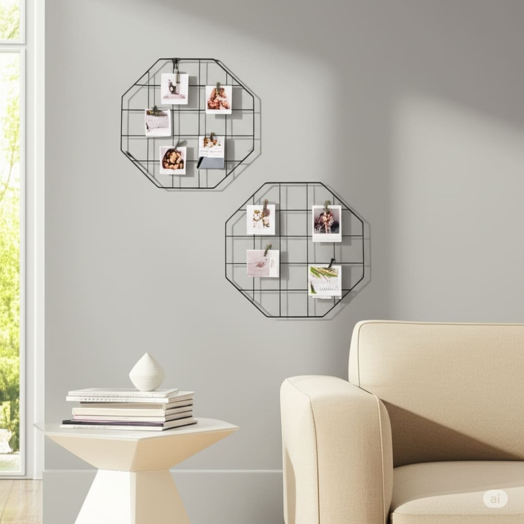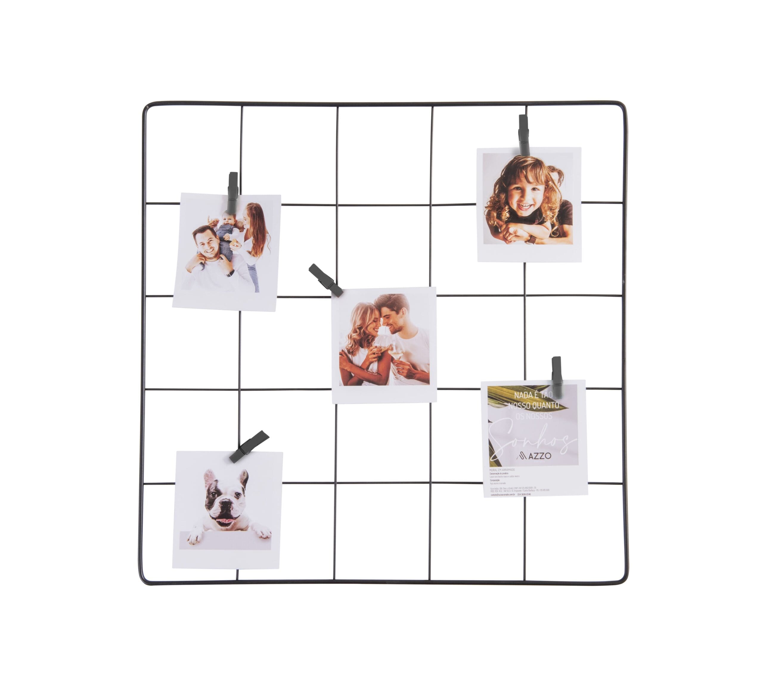 Mural de Fotos Decorativo Aramado – Azzo. Ideal para quem busca dar um toque de personalidade e modernidade a qualquer ambiente, este mural aramado é a solução perfeita para exibir suas fotos e lembretes de forma criativa e organizada.