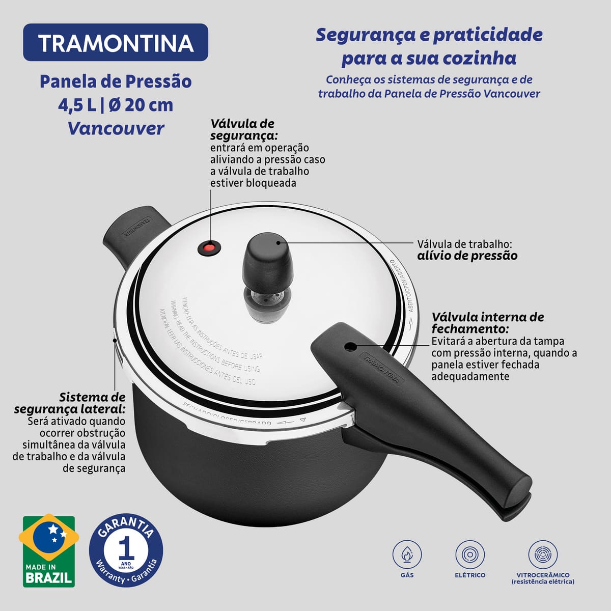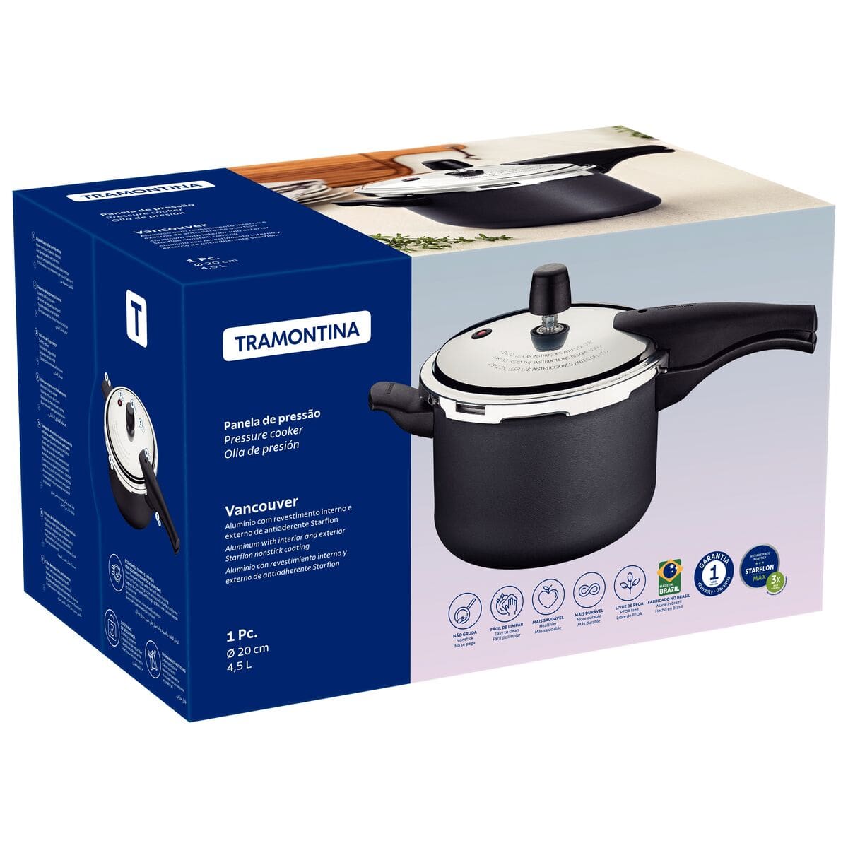 A panela de pressão Tramontina Vancouver em alumínio com revestimento interno e externo antiaderente Starflon Max. 20 centímetros de diâmetro 4,5 litros é o item que vai fazer a diferença em sua cozinha!