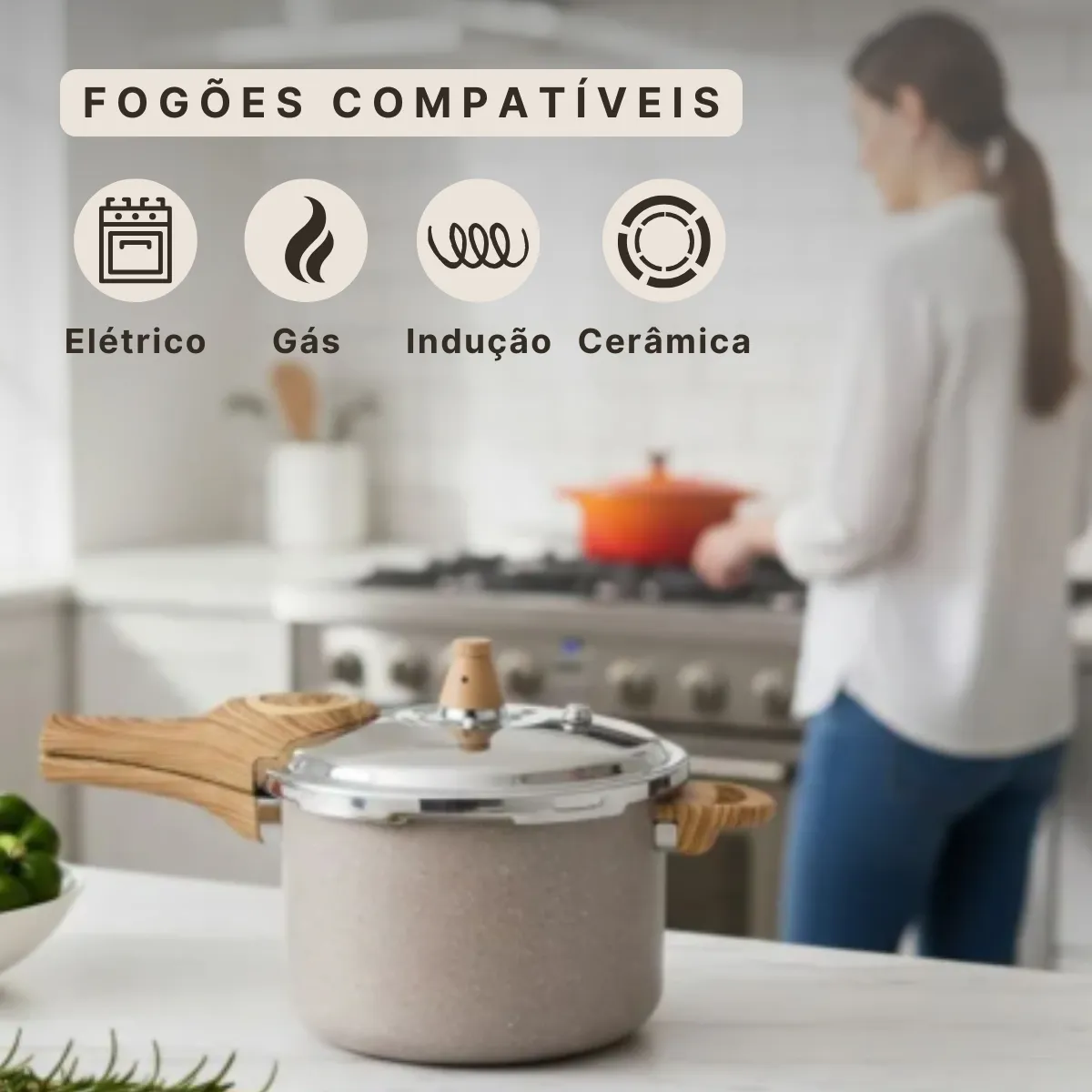 - Fundo Triplo e Indução: Equipada com fundo triplo (Alumínio + Aço Inox + Alumínio ou similar) que garante uma distribuição de calor mais uniforme e eficiente, e é compatível com todos os tipos de fogão (Gás, Elétrico, Vitrocerâmico e principalmente Indução).