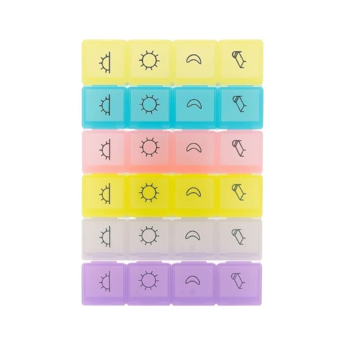 Chega de confusão e esquecimento! O Porta Comprimidos Casita conta com 28 compartimentos individuais, estrategicamente dispostos para facilitar a organização diária. São 7 linhas e 4 colunas, permitindo que você distribua os medicamentos por: