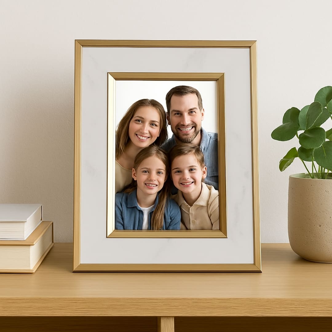 Transforme seus momentos especiais em parte da decoração com o Porta-Retrato Marble 15x20cm. Com acabamento marmorizado e moldura dourada, ele une sofisticação e funcionalidade para valorizar fotos de família, viagens ou ocasiões marcantes.
