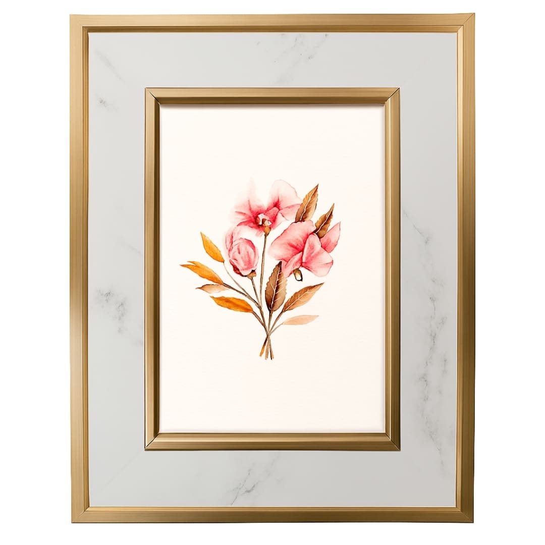 • Design: estilo moderno com borda marmorizada branca e cinza, moldura interna dourada e acabamento refinado