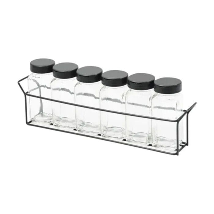 Porta Tempero Bandeja com 6 Potes de Vidro com Tampa de Metal e Suporte de Aço – Em Casa Tem