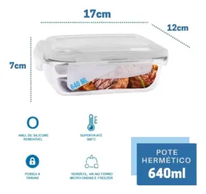 • Capacidade: 640 mililitros (0,64 Litros). É o tamanho ideal para porções individuais, como o almoço ou jantar do dia a dia.