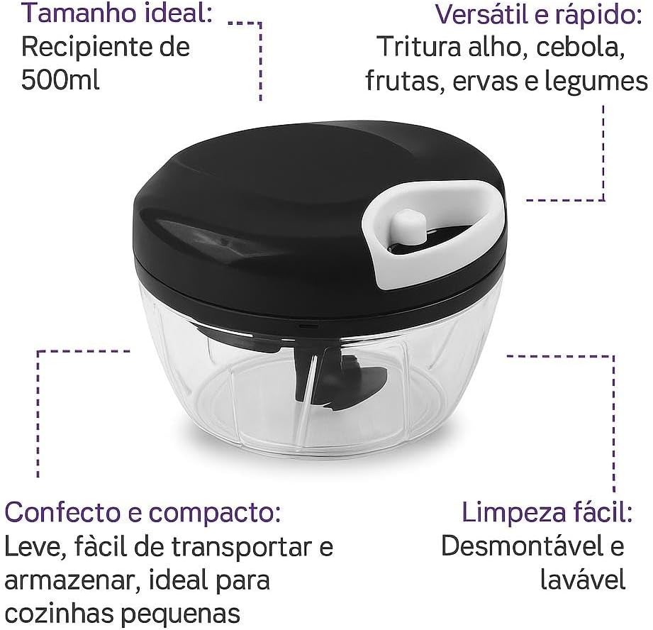 Capacidade: Possui um recipiente de 500 mililitros, um tamanho prático e compacto, perfeito para pequenas e médias porções de ingredientes.